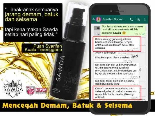 Sawda Minyak Habbatus Sauda mengandungi pelbagai khasiat yang dapat membantu kesihatan secara optimum terutamanya dalam meningkatkan dan mengimbangi imunisasi badan (daya ketahanan badan).